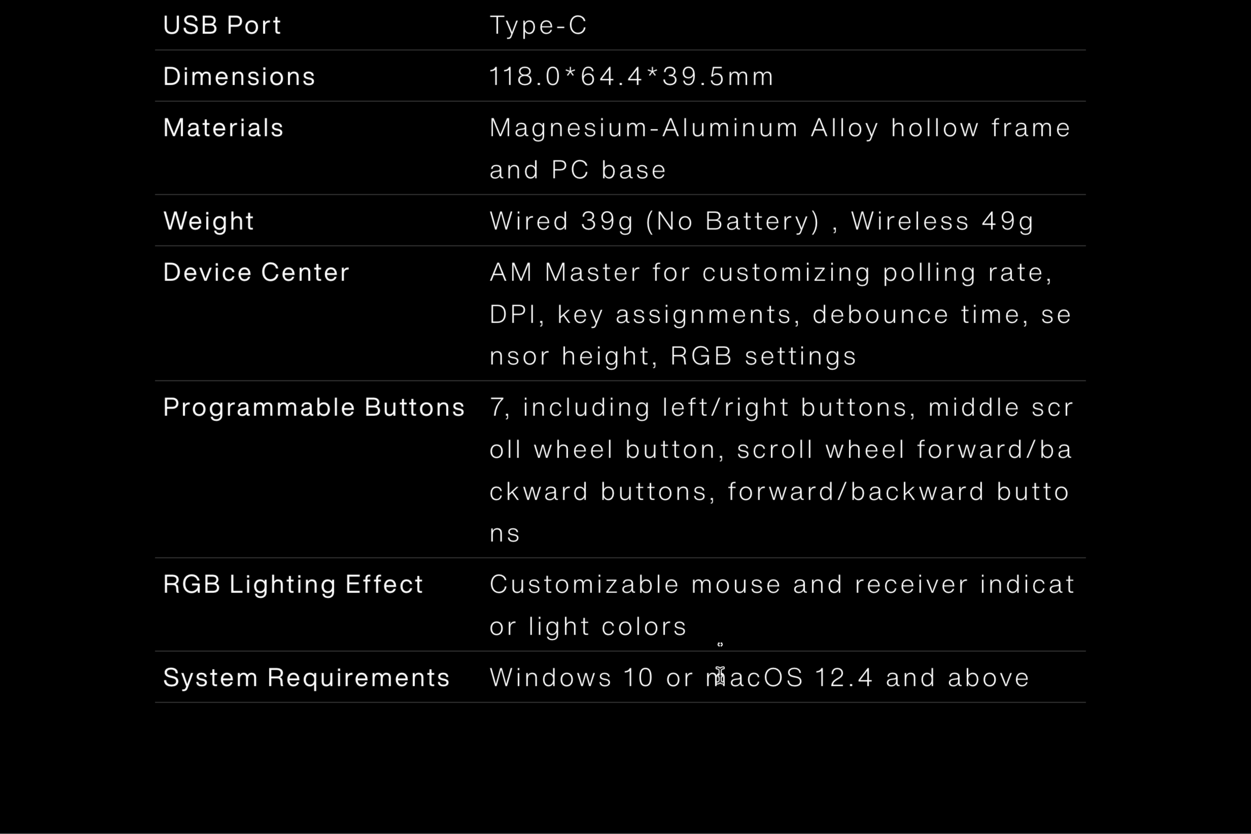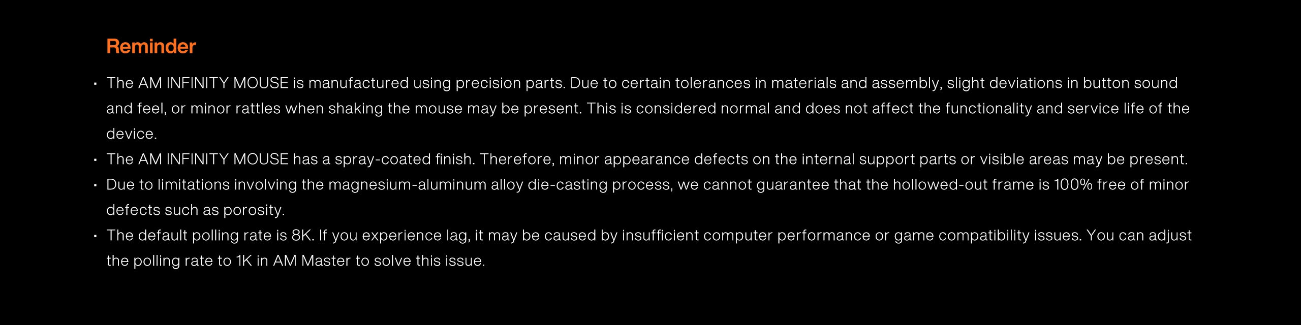 The AM INFINITY MOUSE is equipped with the flagship PAW3950 sensor, delivering unprecedented hardware performance.