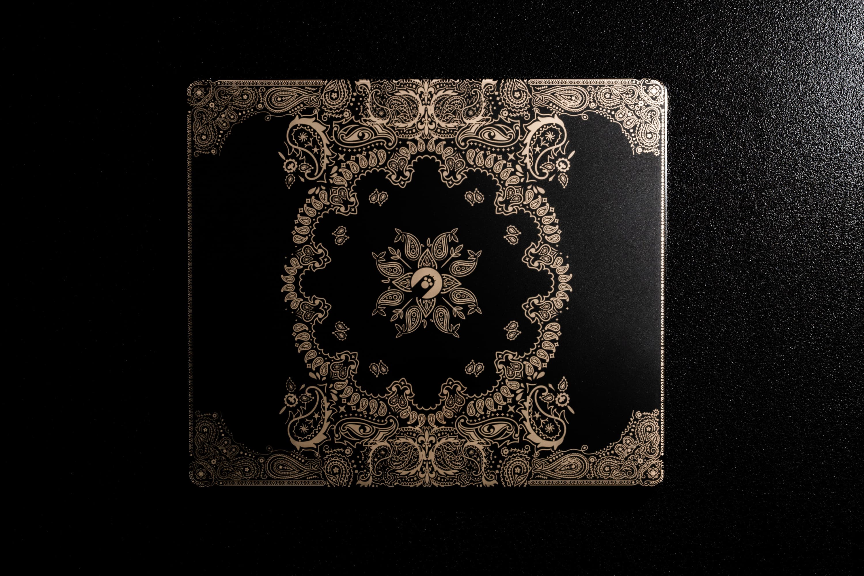 This glass mouse pad features a black and gold paisley pattern with an ultra-fine 2μm etched texture.