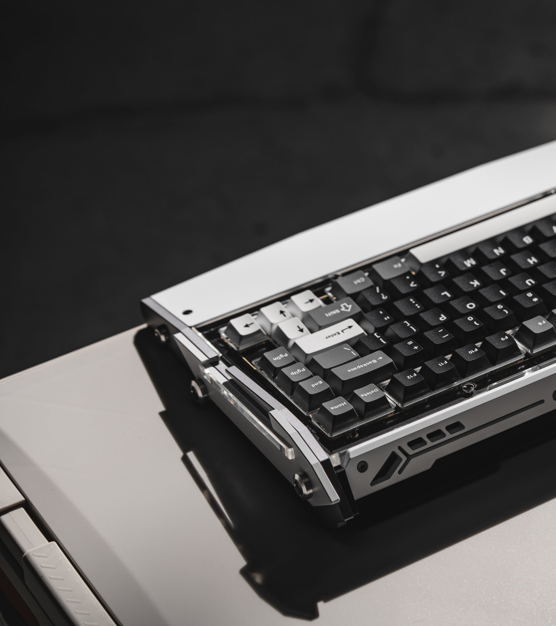 Robuste Handballenauflage und Tastaturkörperteile aus geschmiedetem Carbon. Verkörpert Black Diamond 75 als leistungsstarke Gaming-Tastatur.