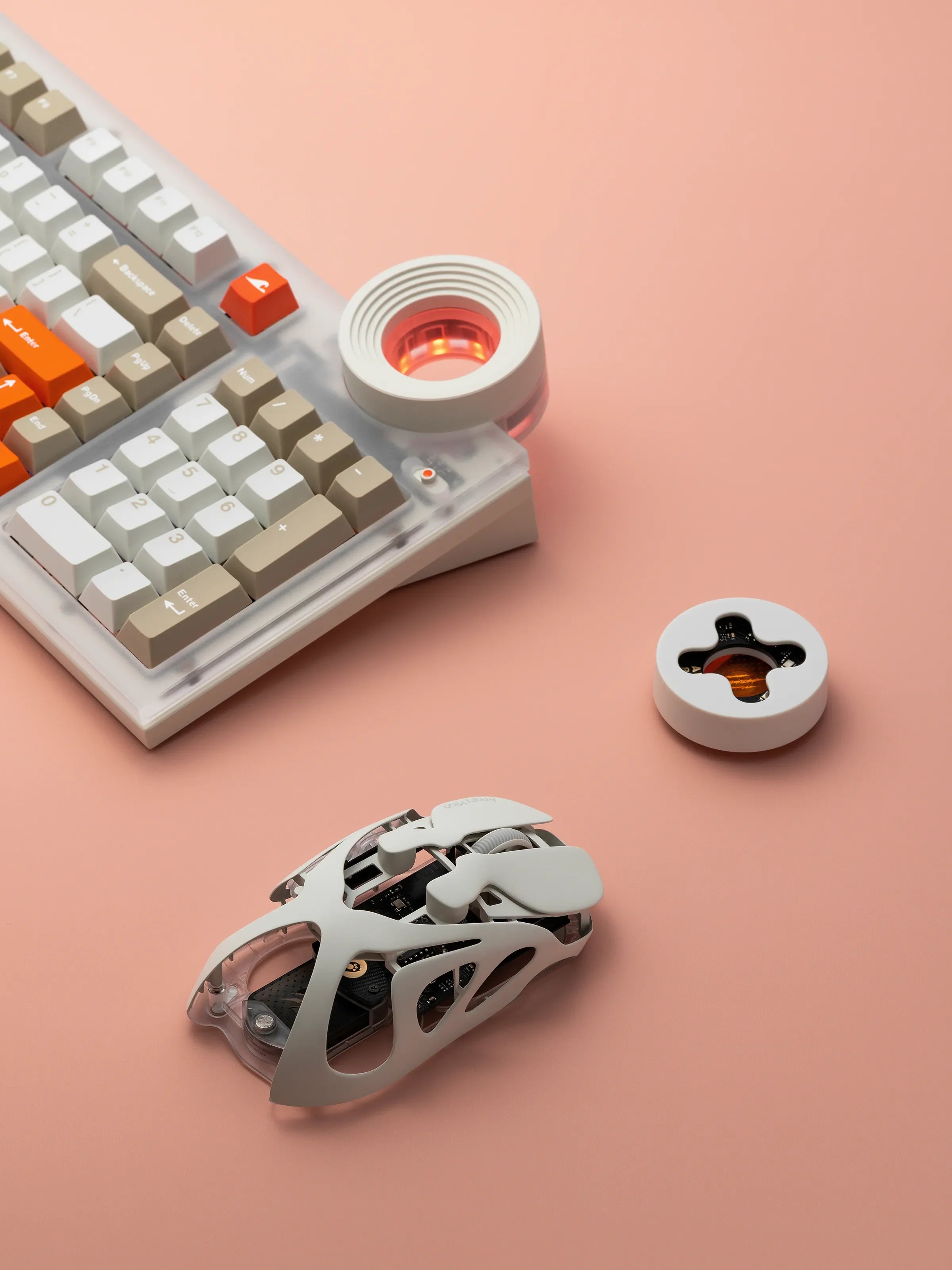 Guided by these design principles, we highlighted the mounts, gold-plated PCB, and RGB-lit switches to bring out the keyboard’s inner beauty.