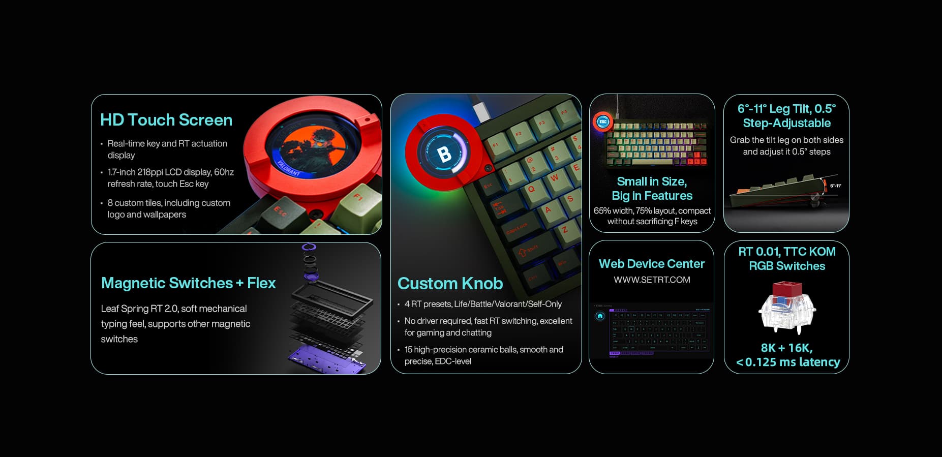 4 selectable modes, 1.7-inch HD touch screen, real-time key indicator, custom backgrounds, detachable, virtual Esc key
